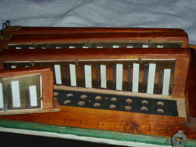 Алекс, понимаю, что вам непривычно видеть широкие рамки меха, обтянутые замшей, с уголками, большими по размерам, чем на полукорпусе. Дело вот в чем. Все Сунцовские гармони имеют широкую рамку меха, обтянутую тем же материалом, что и ребра меха, а так же большие по размерам уголки рамки меха, связанно это с тем, что первоначально на гармонях рамка меха была как бы большей частью полукорпуса, как на саратовской или ливенской гармонях. Для надежности их укрепляли уголком. В последующем появились механизмы в басе, позволяющие открывать комбинации клапанов, и полукорпус стал немного шире, правый полукорпус стали делать под стать левому, но конструкция меха осталась прежней, поэтому визуально все гармони рубежа 19-20 веков конструктивно так выглядят. Фото одной из поздних Сунцовских гармоней, найденное мной в интернете, наглядно это демонстрирует. Так же для наглядности фото ранней Тульской а так же ливенской.