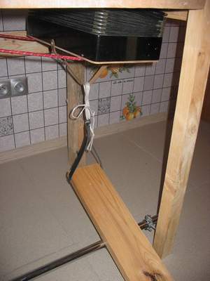 Недавно закончил ремонт в квартире, а из подручных материалов соорудил за вечер стол для настройки. Как говорится: "я его слепила из того что было". Меха от разбитого нерабочего баяна "Тула", в качестве уплотнения между мехами и столом - обрезки лайковых перчаток и монтажный силикон, ремни от собачьего поводка, труба металлическая - от встроенной мебели (остался обрезок шкафа), шарнирное крепление - осталось от креплений водопроводных сантехнических труб. Пружин для сжатия меха не подвернулось подходящего размера - временно использую резиновые жгуты.