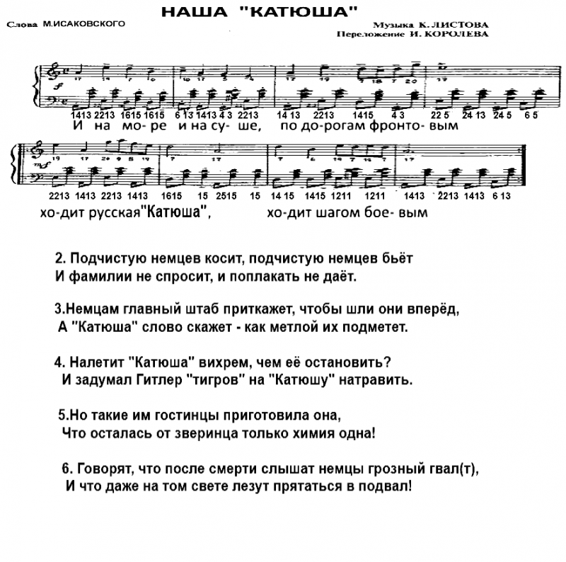 К юбилею Победы. Эту песню на всех утренниках, посвященных советским праздникам, распевал хор нашей начальной школы в конце 50х годов под рукрводством моей матери - участницы войны. Песню я считал народной, пели мы её на мелодию "Тачанки" (без припева). Но, оказывается, у неё есть авторы (интернет доложил). Слова написал М.Исаковский по просьбе командира дивизиона "Катюш" в 43(44г?). Была написана и оригинальная мелодия В.Захаровым, ркководителем хора им.Пятницкого., но мать говорила, что услышала её именно на мелодию "Тачанки"