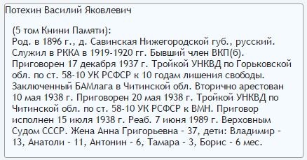 В деревню приехал воронок с ежовскими церберами в синих фуражках, обыскали они дом Василия, нашли пару гармоней, над которыми он корпел ночами, экспроприировали их. Больше Анна своего дорогого мужа не видела. Легенда от потомков брата Василия - Ивана Яковлевича гласит, что служил один парень из Совинского на Дальнем Востоке и видел, якобы, там могилу В.Я. Потехина.